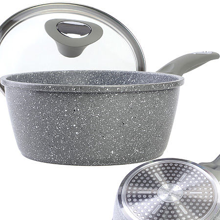 Ковш с крышкой от MAYER&BOCH - прочная штампованная алюминиевая посуда с антипригарным покрытием. Цвет: серый, мраморная крошка. Крышка в комплекте из жаропрочного стекла, со стальным ободом и с пароотводом. Ковшик подходит для всех типов плит, включая индукционные.