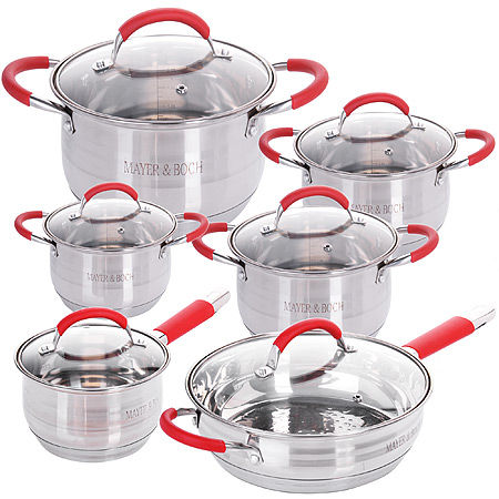 Кастрюля MAYER&BOCH изготовлена из высококачественной нержавеющей стали с 9-и слойным индукционным дном. В комплекте 12 предметов: 4 кастрюли с крышками, 1 сотейник с крышкой, 1 сковорода с крышкой.Изделия снабжены крышками из термостойкого стекла с паровыпуском и металлическим ободом, а также не нагревающимися стальными ручками с силиконовыми накладками. Подходит для использования на всех типах плит. Подходит для мытья в посудомоечной машине.